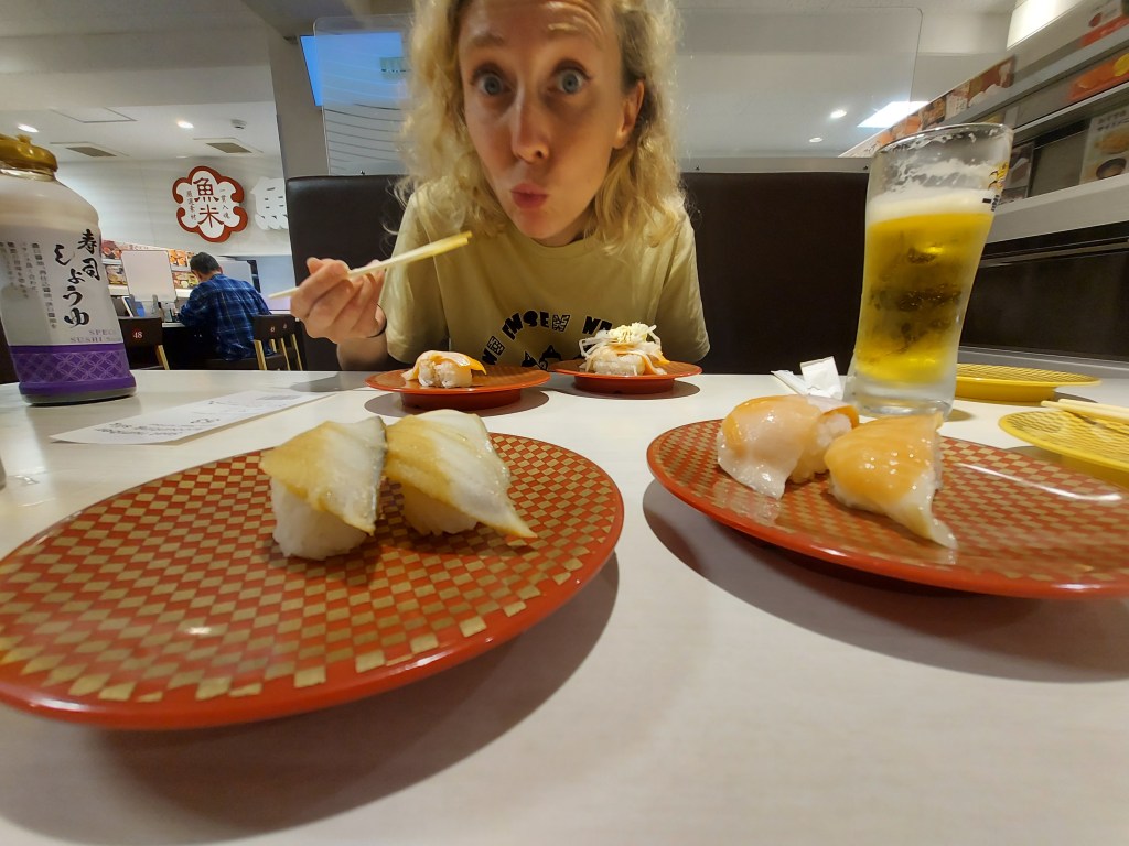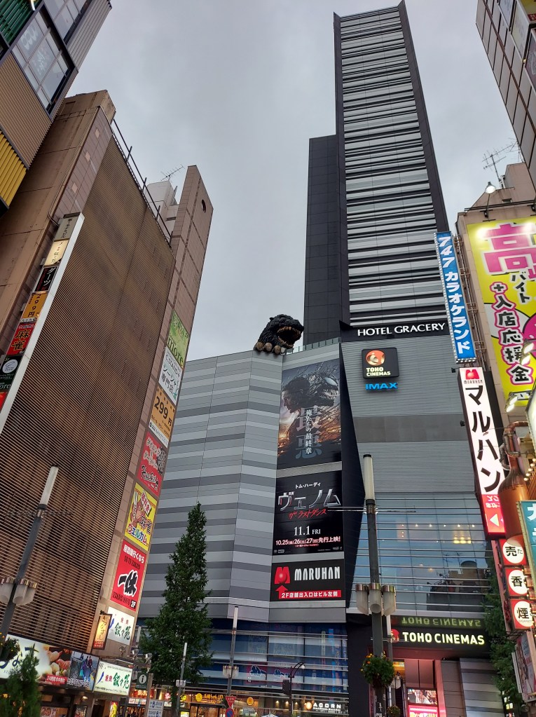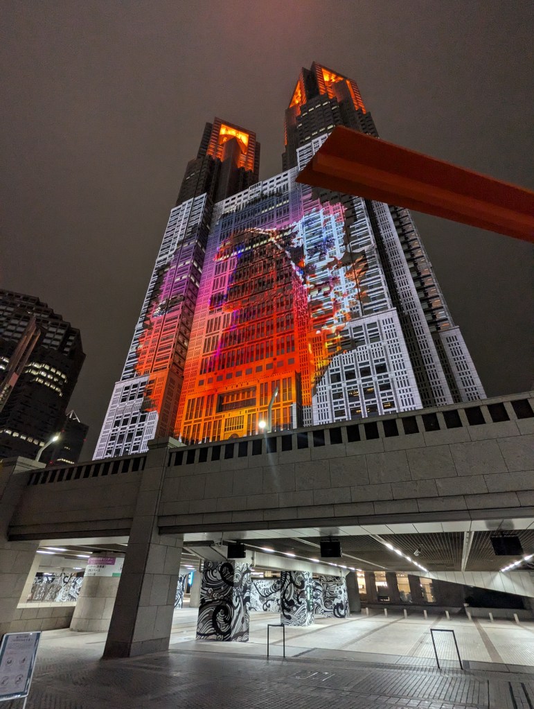 In Shinjuku we walked to the godzilla head to film a rap take for Jives and then we walked to a Genki sushi in Korea town. We had been in Japan for two weeks and hadn’t had any sushi yet! We were seated at a table together and ordered beer as well as our favourite sushi; the seared salmon, seared tuna and some new favorites. The total came to just over 5500Yen ($55). We paid at the self-serve machine and then walked to the godzilla light display at the Tokyo Metropolitan building.