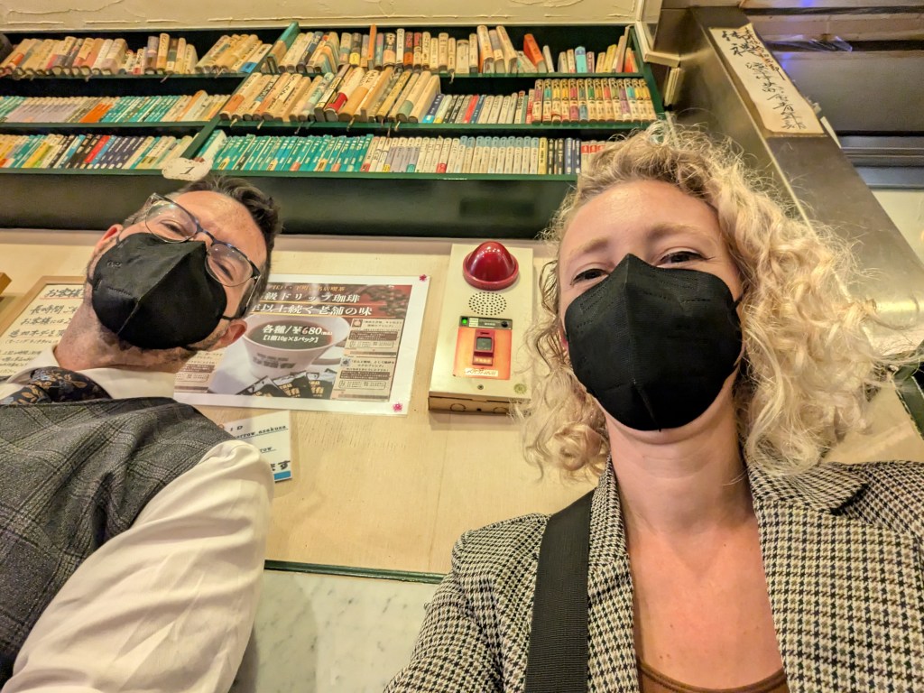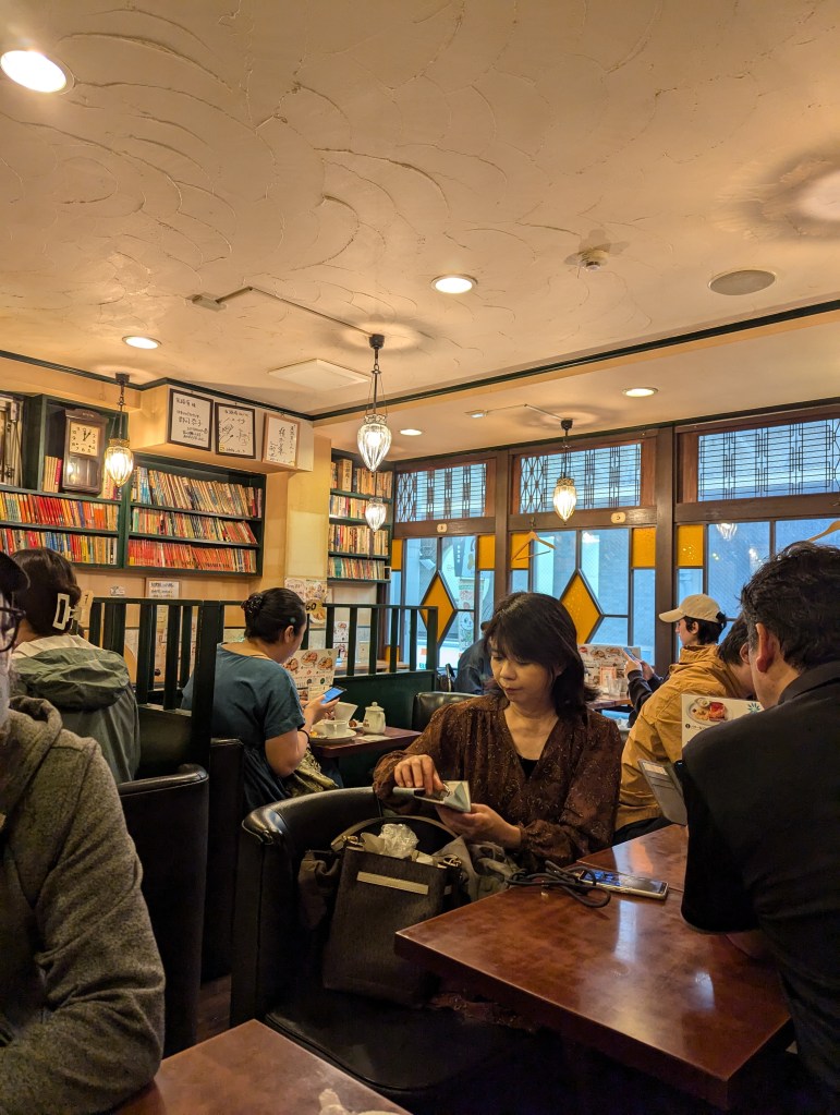 The shop was pretty tiny and lined with novels and shelves as well as stained glass windows in the front. We ordered on an app. Jives and I both got the same thing, a toast set with cheesy toast, egg and a cabbage salad with miso soup and coffee. The bill for all three of us came to 2300 Yen. Harit paid for it despite our protest.