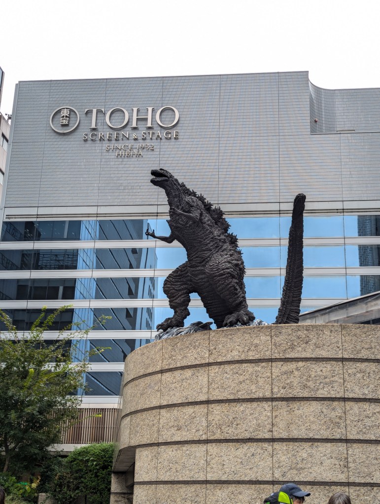 While waiting to use the washroom at the station, I found a collection of Panda bear themed gachapon which of course I had to try my hand/luck at!…. AND there was a GIANT Genma mural, the Panda from Ranma ½ . Ueno Park is home to a small zoo, so the station is often Panda themed or at least animal themed. After purchasing our share of Panda gachapon figurines, we took the JR line to Ginza to find a Godzilla statue. We took the train to Yurakucho station and then walked to “Hibiya Godzilla Square”. I can’t believe there is actually a Godzilla square in Tokyo! I wonder if this is just a temporary thing for the 50th anniversary of the Godzilla film. We found the statue quite easily, but the area was quite chaotic, as the Tokyo film festival was on and a red carpet area was set up with many walkways and roads closed off. We took quite a lot of time trying to get back to the JR train after we had taken our fair share of photos of both the Godzilla statue and the various other adorable Godzilla themed things in the square.