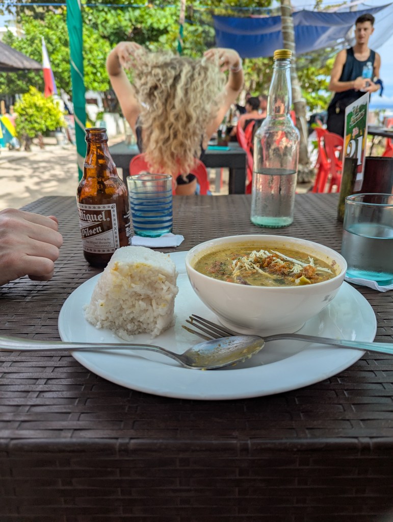 We relaxed for a moment on our balcony before setting out towards “Bounty Beach” to have a late lunch at “Villa Potenciana Restaurant”, a vegan/vegetarian spot right on the beach. The restaurant was a ten minute walk away from our hotel. We sat on the beach and I ordered a Mongo Curry, a Philippines special and Jives got a Pita Burger. The “burger”was a large sloppy plate of veggies on a bun! My curry was delicious, it used a Filipino bean I had never heard of that tastes a lot like a lentil, with many veggies and rice. You pay as you order so it was nice that we could just get up and leave when we were done.