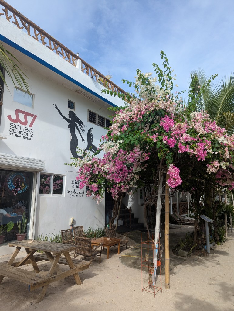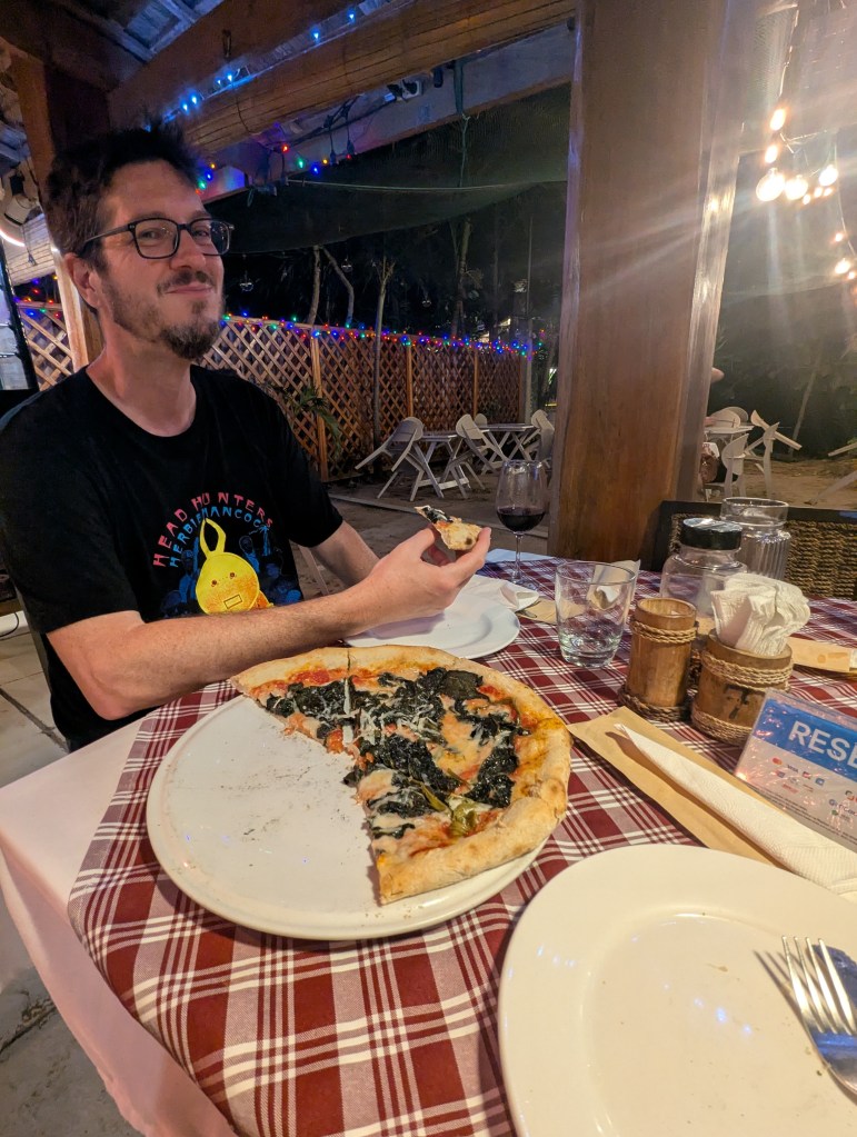 We got out of the water just before the sun set below the horizon, drying off before heading out to find some dinner. We ended up at a place called “Angelina”, an Italian restaurant with outdoor seating under a huge tree on the beach. We sat down and the waitress warned us that if it rained there was no room indoors. We took our chances. We ordered a spinach and parmesan cheese pizza and two glasses of red house wine. It did begin to rain lightly, and the ladies insisted we sit indoors at a reserved table whose reservation was at 8:30pm (it was 7:00pm). They also dragged our neighbours table in and put it under the awning, but it never did really rain, only some drops. We left by 7:30pm, so plenty of time to set our table back up for the next group. Only one negative note, we got charged for a 500 peso salad we didn’t order and we had to ask the server about it which always causes so much anxiety for us. The issue was fixed and it was no big deal, we just would normally rather pay then make a deal about something like this.