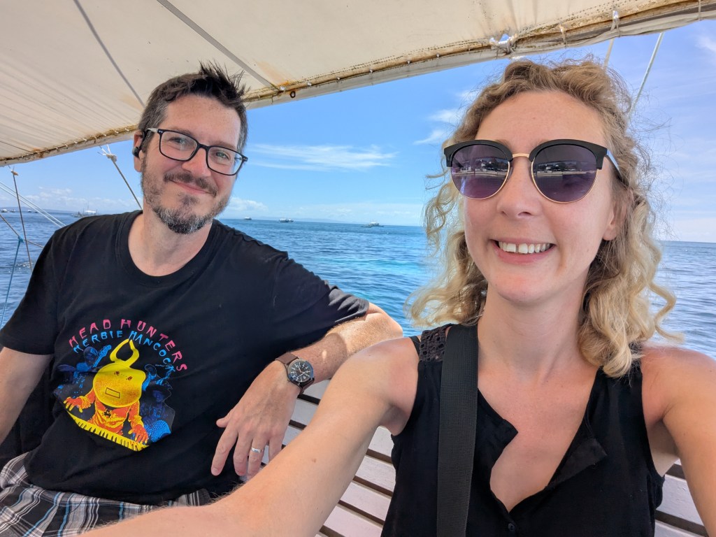 We then had breakfast and returned to our room to finish packing up our bags. We had a coffee and then headed to the boat dock at 11 thinking we would sit in the sun for a while before the boat left at 11:30am, but immediately the boat captain came up to us and said he was ready to go. We walked out to the shore, the tide was out further then when we had arrived so we had to take off our socks and shoes and walk through the water before climbing a ladder and coming aboard. The ride was lovely, about 39 minutes to Maya port. I was sunnier then it had been on our trip over.