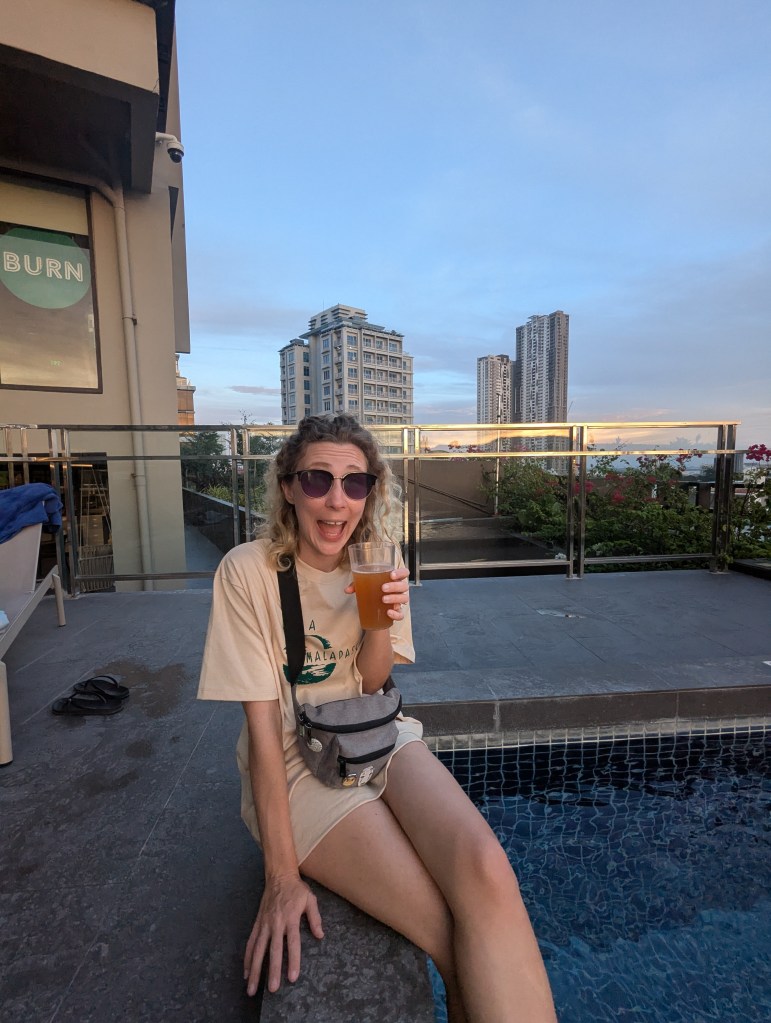We arrived at our hotel at 3:30pm and made our way to reception to check in. It was super easy. Our room was 1111 on the 11th floor. It was a small room but nice. We then headed to the mall on the ground floor and had a pizza to share (creamy spinach and an iced tea). We then headed to the hotel pool where we spent the remainder of the evening swimming in the super warm lovely pool. We got two craft beers from the reception bar and watched a gorgeous sunset as bats came out at night.